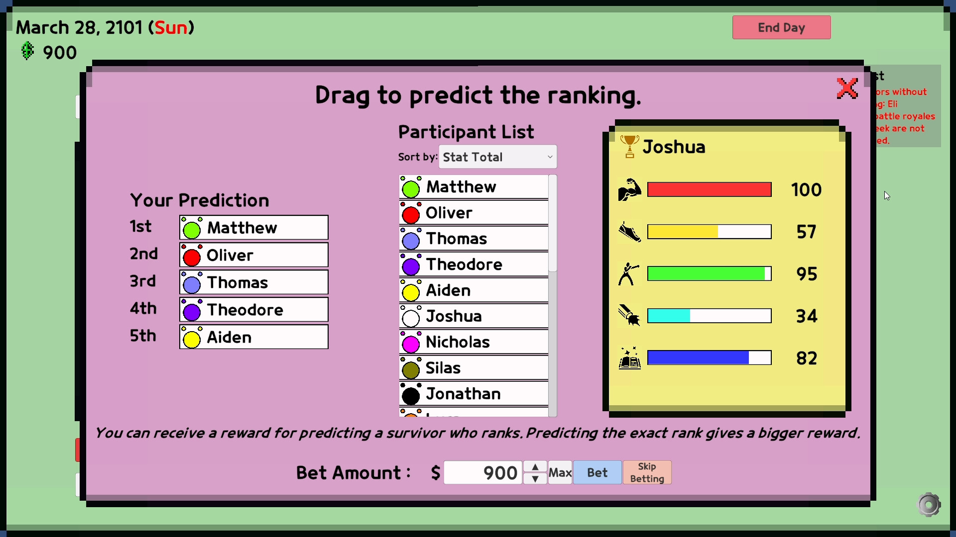 在 Battle Royale Manager 中,您不直接控制战斗者——您培养他们。训练幸存者,制定个性化策略,下注预测胜者,并观看完全由AI模拟的战斗皇家比赛的混乱展开。您不是战士,而是战斗背后的策划者。
